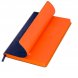 На ощупь поверхность гладкая, глянцевая, фактурно ощущается характерный для кожи мелкий рельеф. Не образует заломов, не расслаивается. Цвет обложки – темно-синий, глубокий, насыщенный, однородный. Тон за счет фактуры может меняться в зависимости от освещения. Цвет матовых форзаца и нахзаца – сочный оранжевый. Ярко контрастирует с обложкой. Срез матовый, выполнен в тон форзаца и нахзаца.
